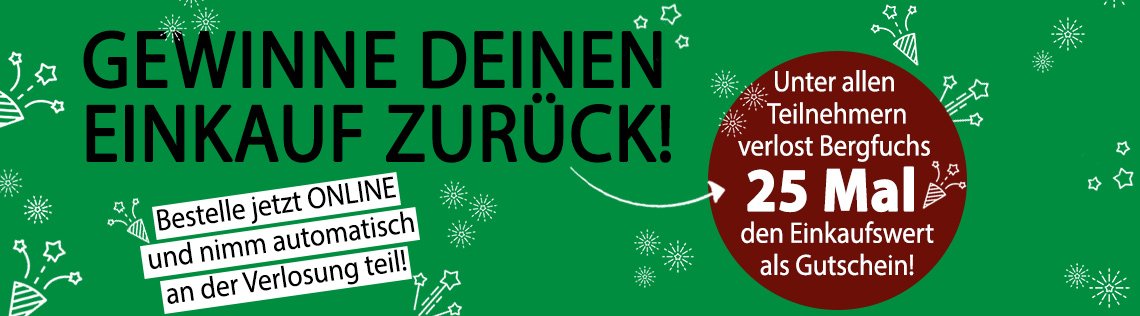 Neben den sensationellen Wochenangeboten, kannst du im ganzen Juni 25 Mal deinen Einkaufswert als Bergfuchs-Gutschein zurückgewinnen! Du kannst sowohl bei Bergfuchs Graz, Wien als auch Online beim Gewinnspiel mitmachen. Wenn du jetzt Online VERSANDKOSTENFREI* bestellst, bist du automatisch bei der Verlosung dabei!