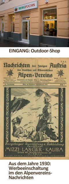 Bei seiner Gründung im Jahre 1983 hatte Bergfuchs-Wien das Glück den traditionellen Standort in der Kaiserstraße übernehmen zu können. Und an diesem Standort halten wir fest – trotz aller Raumprobleme. So wie wir auch an der Unternehmensphilosophie dieser großartigen Bergsteigerin, Schifahrerin und Geschäftsfrau festhalten. Mizzi Langer-Kauba gründete 1896, ebenda, das erste Sportgeschäft in Wien, - spezialisiert auf Bergsteiger-Ausrüstung und –Bekleidung.